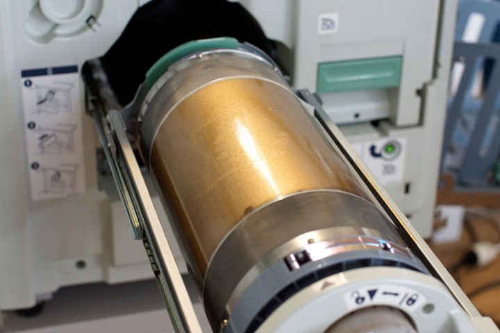 Für jede Farbe benötigt man einen eigenen Druckzylinder, was pro Farbe einen Druckdurchgang mit in der Maschine getauschten Zylindern erfordert. Also pro Farbe einen Zylinder. Wir haben uns bisher fünf Farben gegönnt: Schwarz, Grün, Rot, Gelb, Weiß und Gold, sparen aber für weitere, also gerne fleißig unsere Bilder aus dem Onlineshop kaufen, damit wir mehr Spielgeld haben 🙂