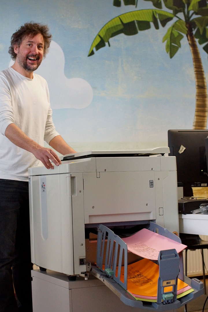 Die Risographie ist ein Schablonendruckverfahren (wie Siebdruck) und dabei noch ziemlich öko: die Farben sind auf Soja-Basis und die Masterschablonen, die für jeden Druck erzeugt werden, aus biologisch abbaubaren Hanffasern.